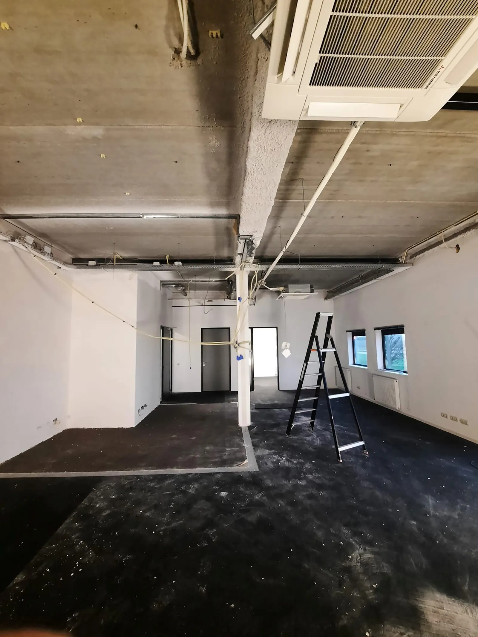 Het plaatsen van nieuwe scheidingswanden en kozijnen, waaronder een glazen wand voor meer openheid.